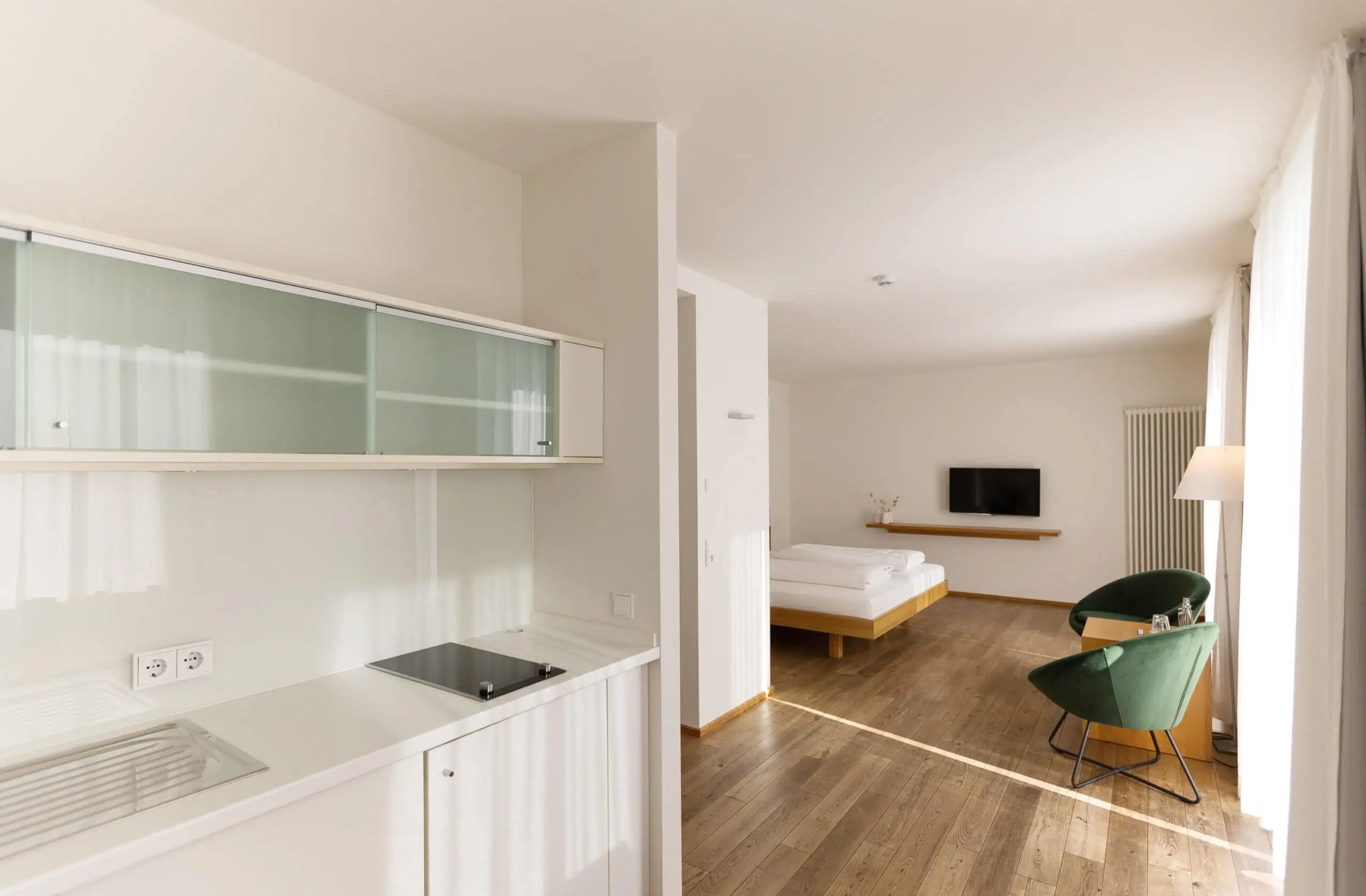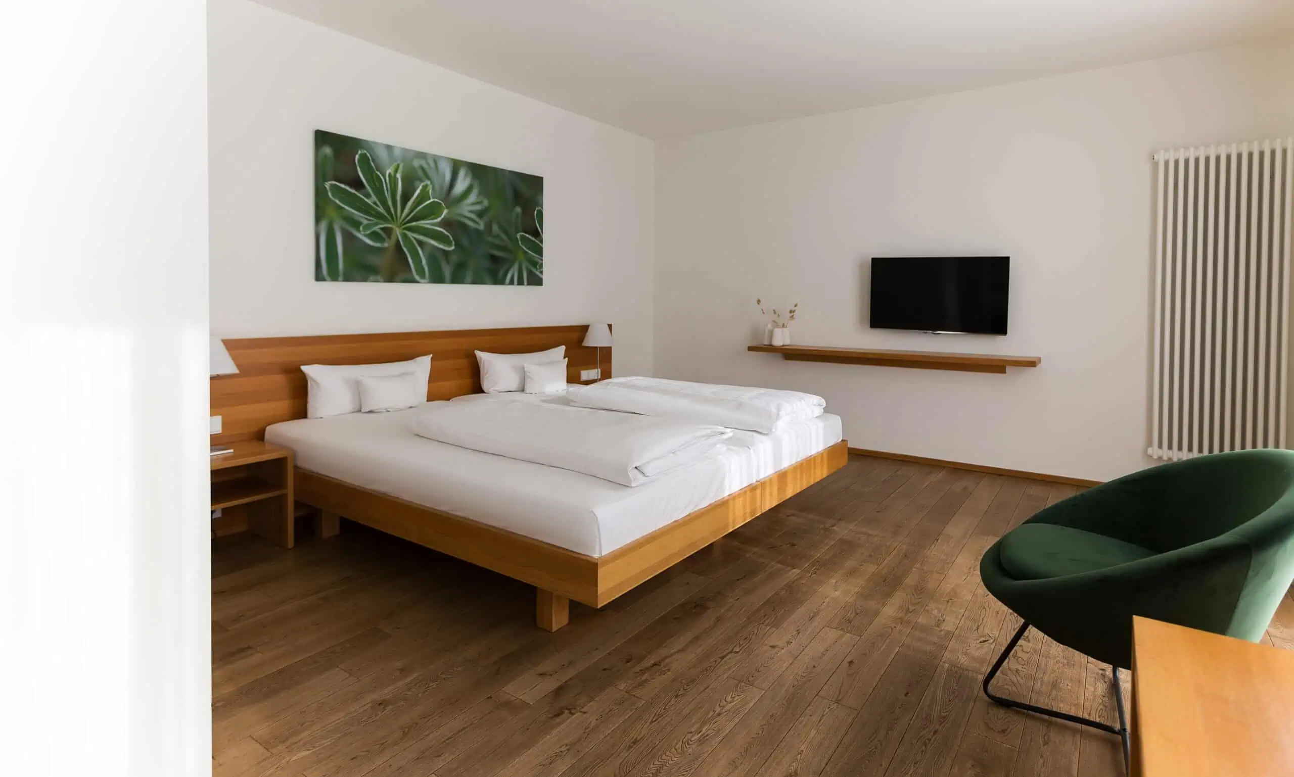 Genießen Sie zu zweit einen erholsamen Aufenthalt in unserem Komfort-Doppelzimmer: Hier wartet eine traumhafte Aussicht dank bodentiefer Fenster in unsere Parklandschaft sowie eine Terrasse mit Sonnenliege und Sitzmöglichkeit zum Entspannen auf Sie. Das moderne Badezimmer ist mit einem Doppelwaschtisch ausgestattet und bietet Ihnen wahlweise eine Dusche oder Badewanne. Vier unserer Komfort-Doppelzimmer verfügen über eine Verbindungstür und sind daher auch für Familien eine gute Option.