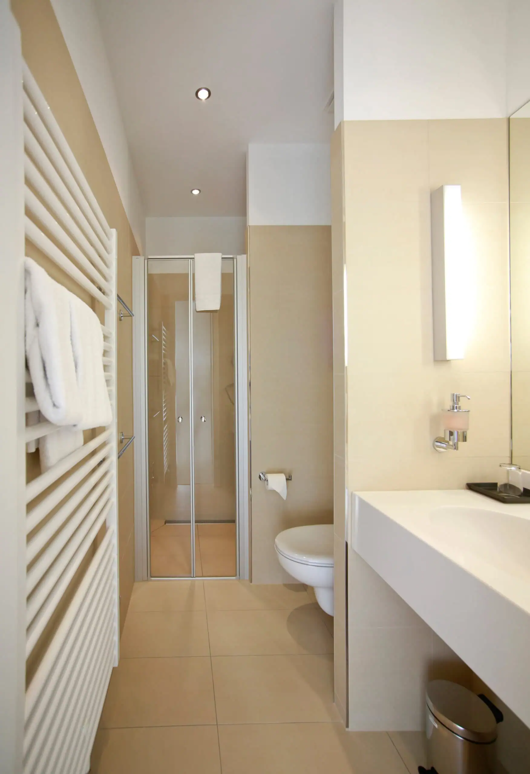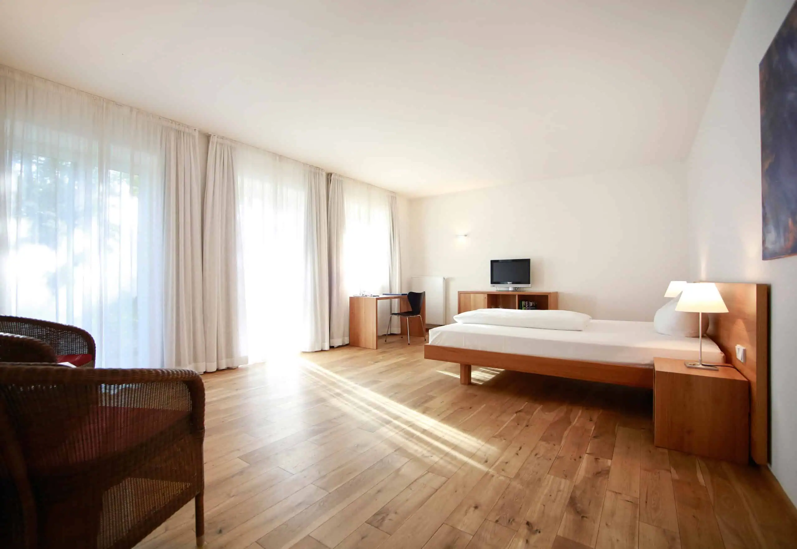 Gönnen Sie sich bei längeren Aufenthalten doch ein Komfort-Einzelzimmer in unserem B&O Parkhotel: Mit 36 Quadratmeter finden Sie hier viel Platz zum Durchatmen vor und in einem 160 x 220 cm großen Queensize-Bett guten Schlaf. Wahlweise steht Ihnen eine Dusche oder eine Badewanne in einem modernen Badezimmer zur Verfügung. Aus bodentiefen Fenstern genießen Sie den Blick ins Grüne und können auf der Zimmerterrasse entspannen.