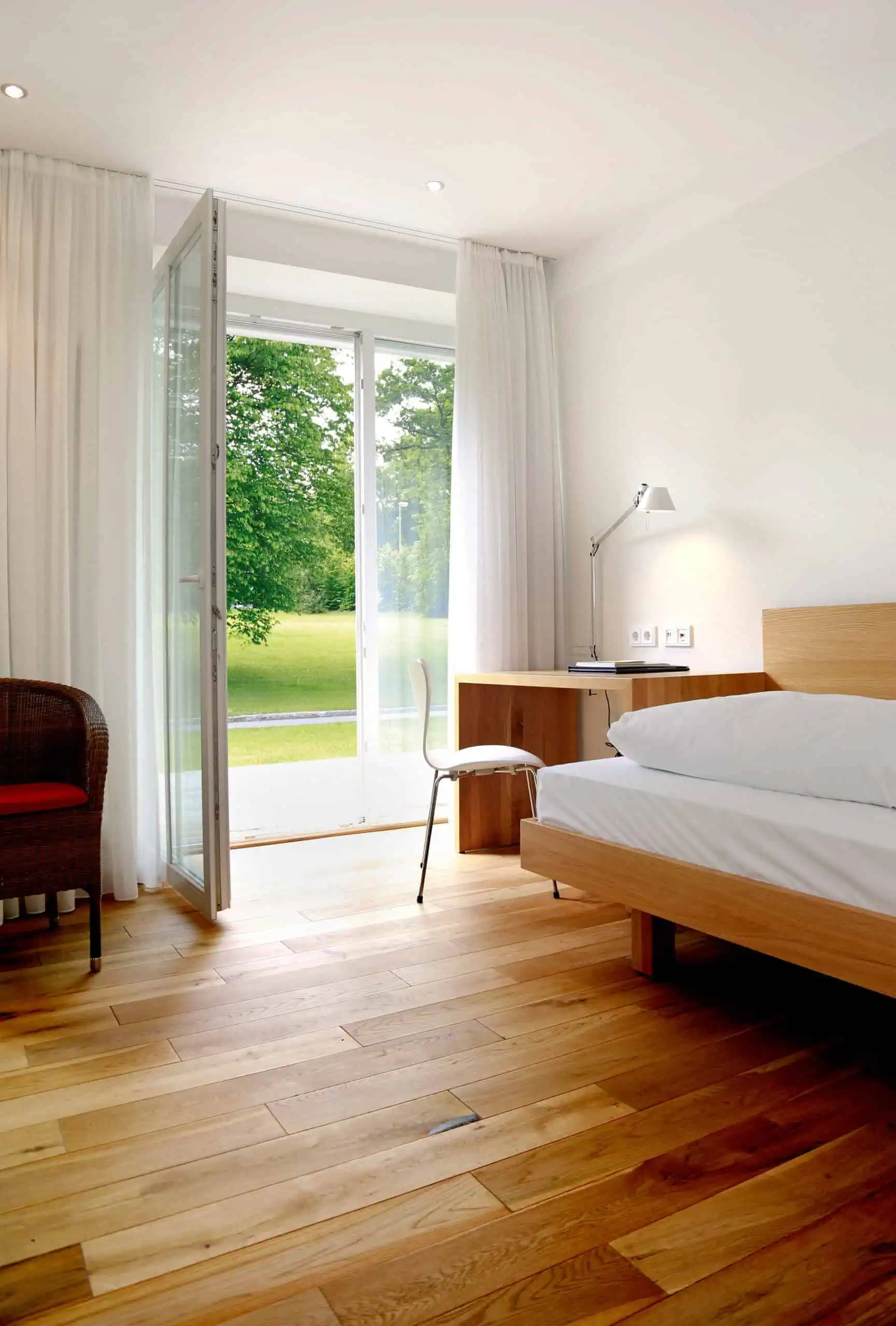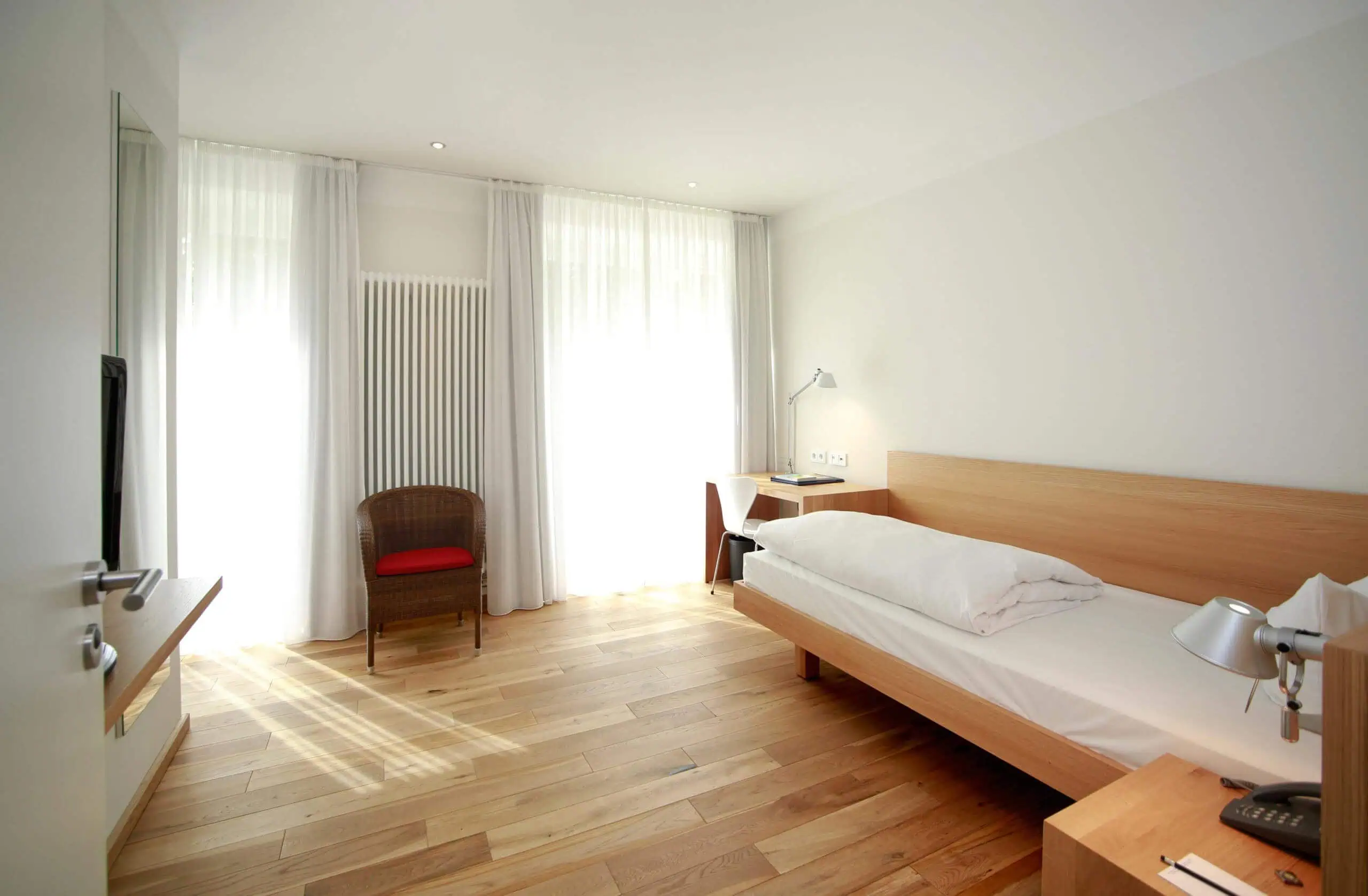 Für kurze Aufenthalte finden Single-, Allein- oder Geschäftsreisende in unseren Standard-Einzelzimmern sowohl Komfort als auch Funktionalität. Diese sind mit 20 Quadratmeter großzügig bemessen und mit einem Einzelbett (100 x 220 cm), einem Duschbad sowie einem funktionalen Arbeitsplatz ausgestattet. Wie all unsere Zimmer im B&O Parkhotel sind auch die Standard-Einzelzimmer von natürlichen Materialien wie einem Holzfußboden geprägt, lichtdurchflutet und verfügen teilweise über einen direkten Zugang zu unserem weitläufigen Park.